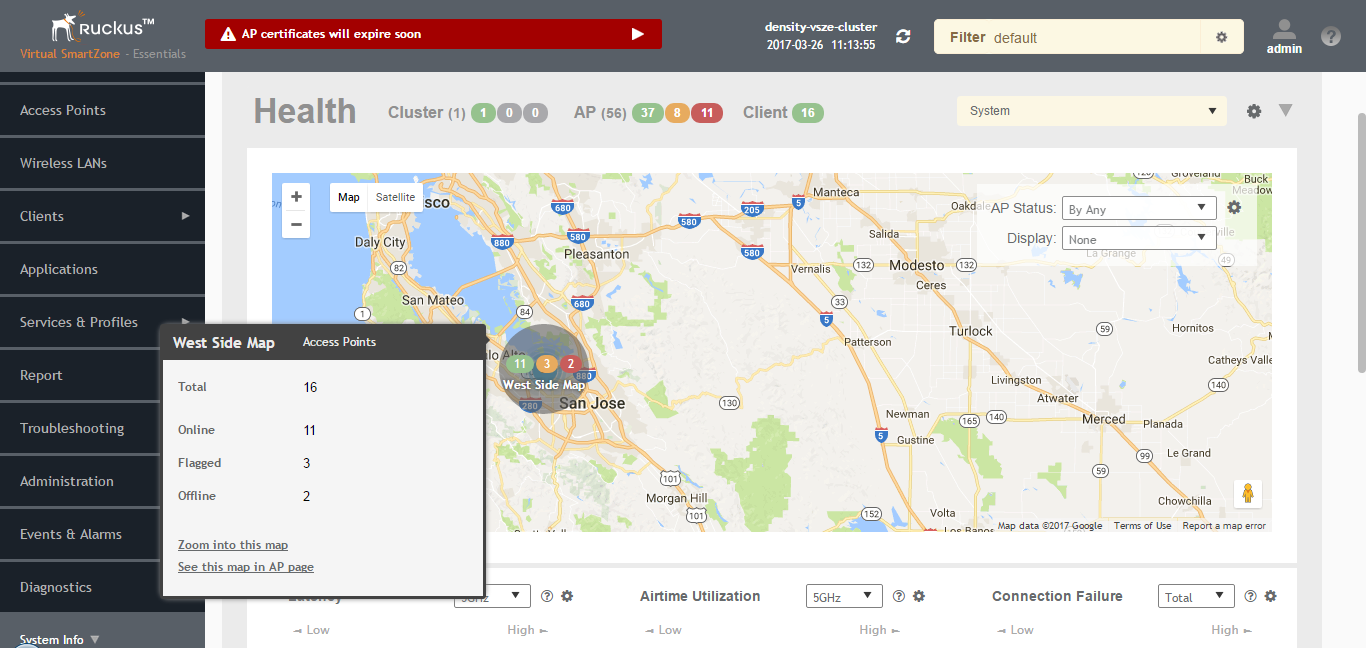 Importing floorplan maps into SmartZone allows you to further customize the information displayed on the Dashboard and Access Points pages, and monitor your APs, zones, groups, clients and traffic statistics all within the world map view on the Dashboard.