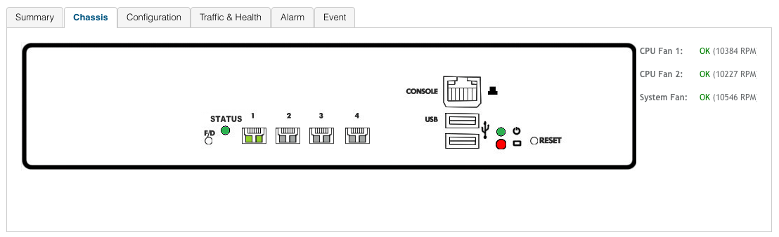The chassis view provides a graphical representation of the control panel (on the front panel of the controller), including the LEDs.