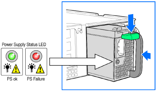 - Press and hold the green safety lock downward while grasping the PSU handle.