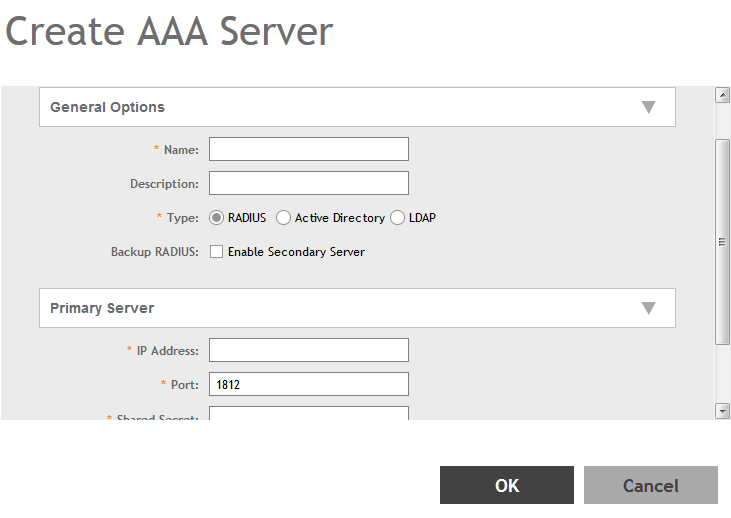 - Type: Select the type of AAA server that you are creating. Options include RADIUS, Active Directory and LDAP.