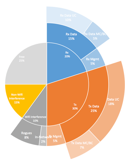 Table 3 Airtime Utilization Statistics Total Total Airtime under observation RxLoad Airtime spent in receiving frames destined to AP in Micro seconds RxInt Airtime spent in receiving frames NOT destined to AP in Micro seconds TxSuccess Airtime spent in transmitting frames successfully in Micro seconds TxFailed Airtime spent in transmit failed in Micro seconds NonWifi Airtime where CCA is busy in Micro seconds RxTotal Same as RxLoad or sum of Rx (Mgmt Unicast + Mgmt Bcast + Data Unicast + Data Bcast) RxMgmtU Airtime spent in receiving Management Unicast frames in Micro seconds RxMgmtB Airtime spent in receiving Management Broadcast frames in Micro seconds RxDataU Airtime spent in receiving Data Unicast frames in Micro seconds RxDataB Airtime spent in receiving Data Broadcast frames in Micro seconds TxTotal Same as TxSuccess or sum of Tx (Mgmt Unicast + Mgmt Bcast + Data Unicast + Data Bcast) TxMgmtU Airtime spent in transmitting Management Unicast frames in Micro seconds TxMgmtB Airtime spent in transmitting Management Broadcast frames in Micro seconds Figure 15 Sample Airtime Utilization Pie Chart