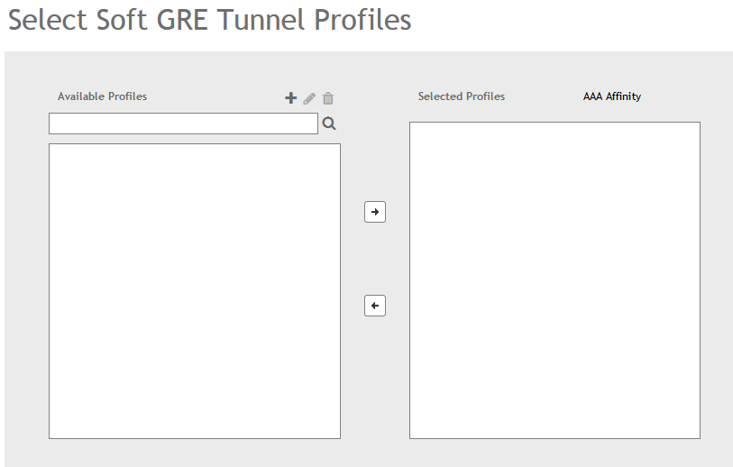 A form appears from which you can select the SoftGRE profiles that you want to apply to the zone. The profiles you can select are displayed under Available Profiles. Select the profile and click the -> icon to choose it. The profile is now listed under the Selected Profiles area.