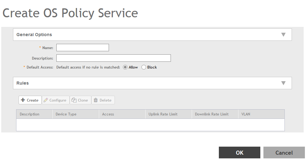 You can control how devices installed with certain OS configurations can be connected to the network, and also control what they can be allowed to do within the network. Using the OS policy service, the system can identify the type of client attempting to connect, and perform control actions such as allow/block, rate limiting, and VLAN tagging based on the OS rule.
