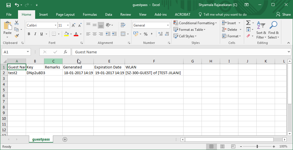 Using Microsoft Excel or a similar application, open the CSV file. The CSV file displays the details of the guest passes, including: