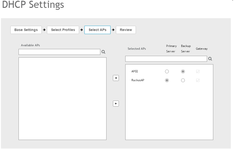 Select APs wizard screen, select the AP(s) that you want to set as the primary and secondary DHCP servers (if you previously selected