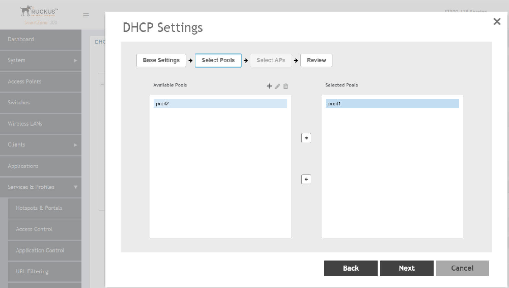 On the next wizard screen, (Select Pools), select up to four DHCP pools from which to assign client IP addresses.