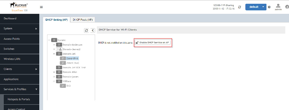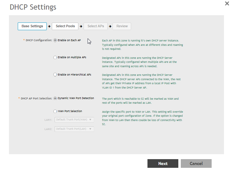 - Enable on Each AP: Each AP in this zone runs its own DHCP server instance. This option is typically used when APs are at different sites and roaming is not required. Now configure the
