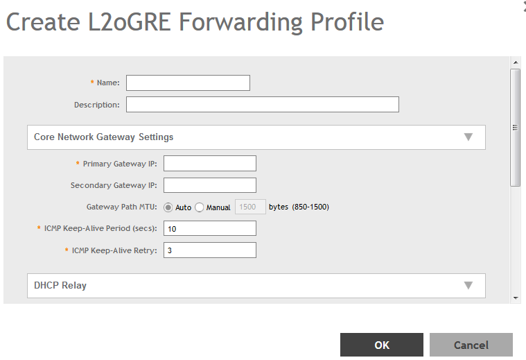 - Secondary Gateway IP: Type the IP address of the secondary gateway for the L2oGRE tunnel. If the primary gateway is unreachable, this gateway will be used for the L2oGRE tunnel.