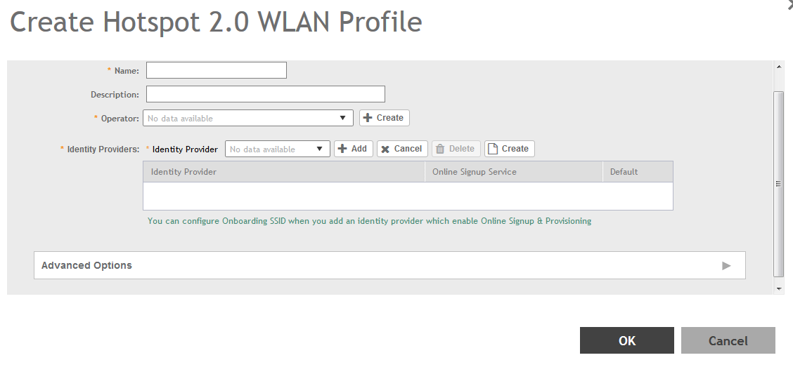 Create to create a Hotspot 2.0 WiFi operator. See Creating a Hotspot 2.0 Identity Provider for more information.