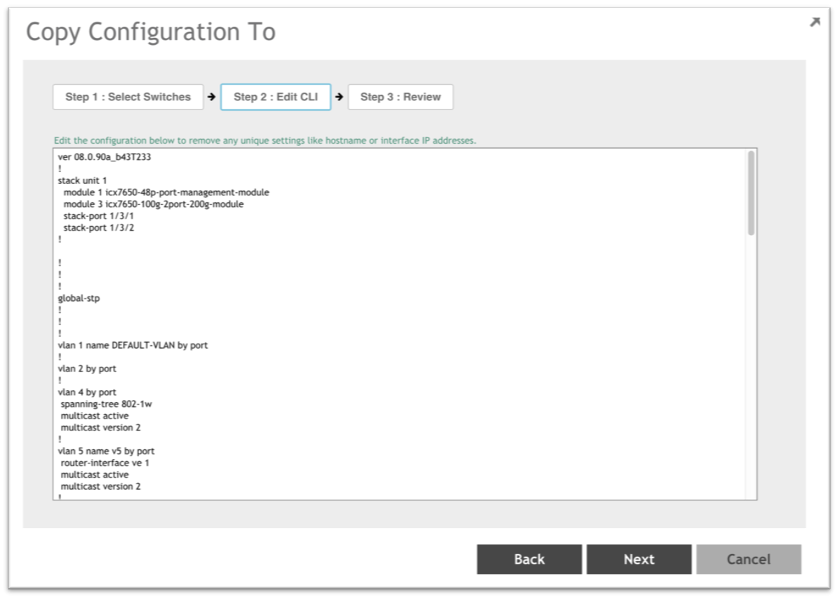 5. Edit the CLI commands to remove unique settings like IP settings and hostname and click Next.