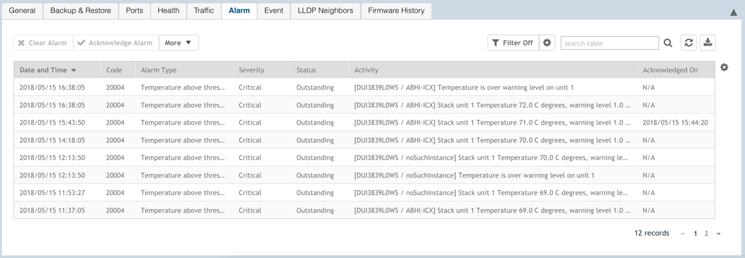Syslog messages from the switch are sent to the controller to periodically communicate switch health and status. It also brings your attention to issues that may need resolution at the switch level. You can view these details from the Alarms tab for individual switches, stacks and switch groups.