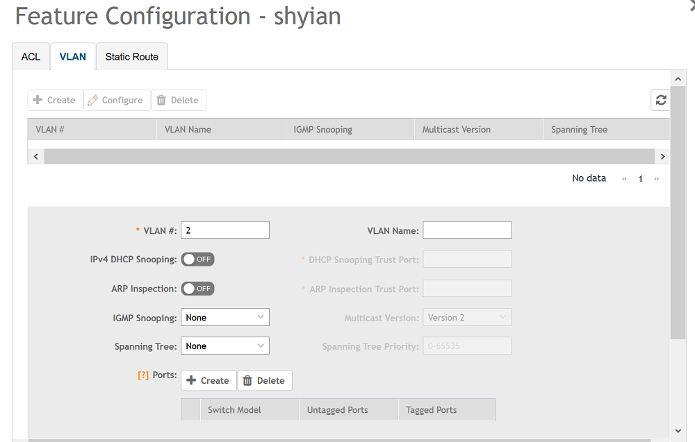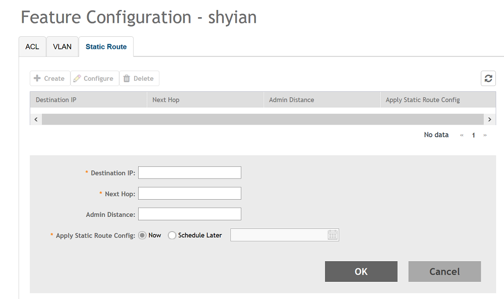 The Feature Configuration page displays details about the ACL, VLAN, and static route. You can create, edit, and delete these configurations as necessary.Figure 70 ACL Configuration