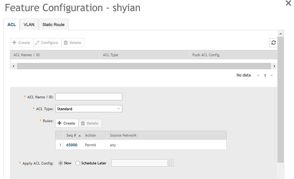 - From Apply ACL Config, you can either select Now or Schedule Later. If you choose to schedule the configuration deployment later, provide the time and date.