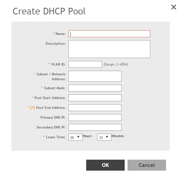 - Lease Time: Enter the IP address lease time, after which clients will have to renew or request new IP addresses.