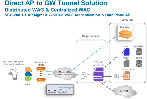 If 802.1x authentication is used, the RADIUS server will be outside of the SoftGRE tunnel. If open, WISPr-based authentication is used, the portal or redirect function will be on the edge router or northbound of the edge router. The controller does not play any role in the control and data path functions.