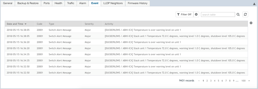 Events are triggered by an occurrence or the detection of certain conditions in the switch. For example, when the temperature of the device reaches warning levels, or when the fan speed changes, an event is triggered. You can view these details from the Events tab for individual switches, stacks and switch groups.