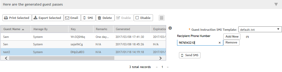 To send guest passes via sms, you must have added an external SMS gateway to the
