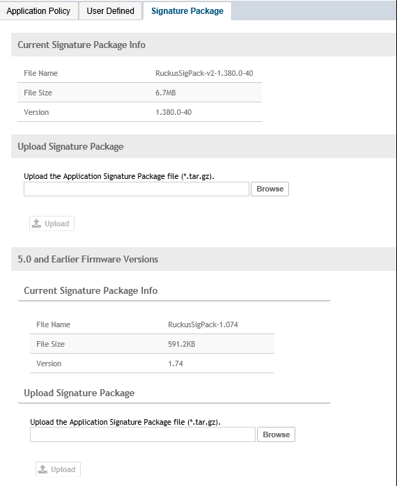 Current Signature Package Info section displays the information about the file name, file size, and version of the signature package.