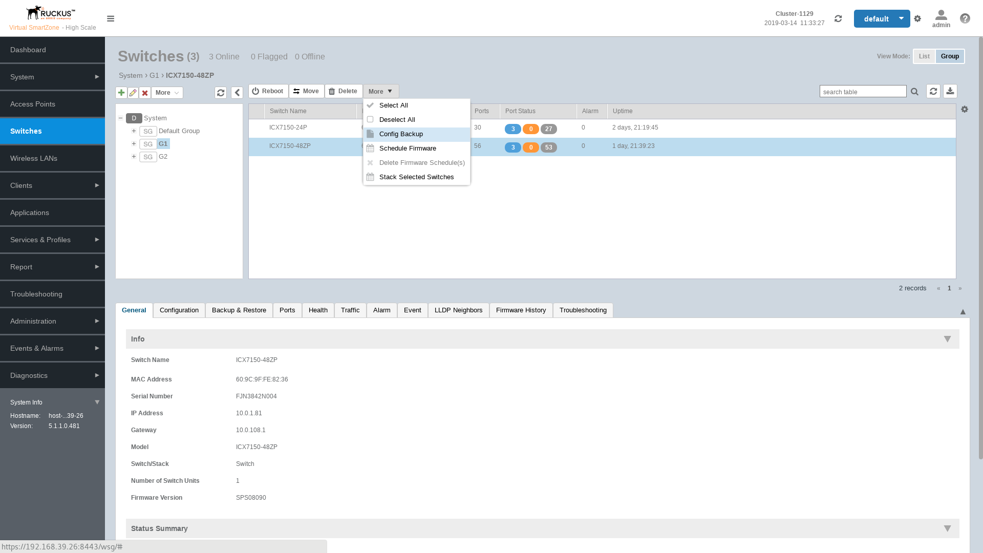 SmartZone can back up the switch's running configuration. By default, SmartZone makes a backup of switch configuration on a daily basis. The configuration is only stored if there is a change between the last configuration backup and the current backup. Otherwise, it is discarded. SmartZone saves the last seven configuration backups. When needed, these backups can be restored to the switch. While performing network maintenance, you can initiate a backup without having to wait for the daily backup.