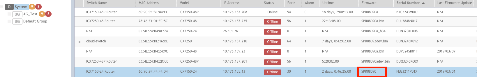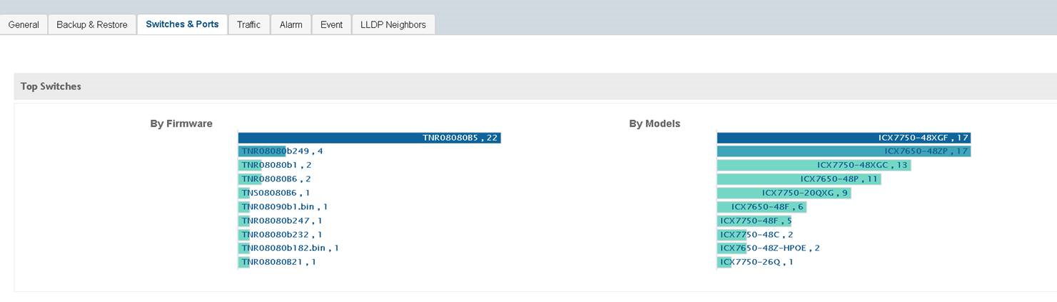 For a switch group, a Top Switches page similar to the following figure is displayed. The graphs provide information on top switches based on firmware and model.Figure 91 Top Switches Page